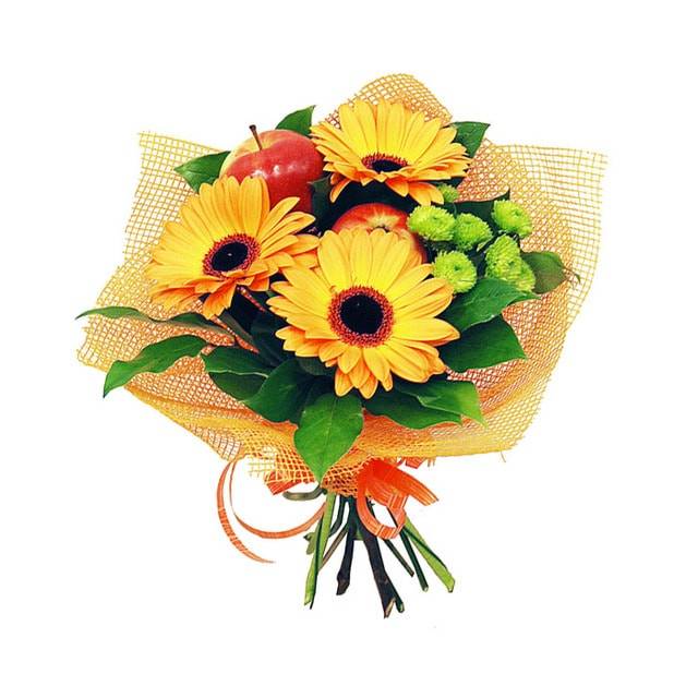 Яркий и необычный букет «Яблоко» состоит из гербер и хризантем. Цветы подойдут для всех близких людей: членов семьи, друзей, дальних родственников, коллег и не только. Особенностью композиции является яблоко, придающее букету колоритность. Подарив такие цветы, покажете привязанность, уважение, скромность и простоту, это незабываемый презент.